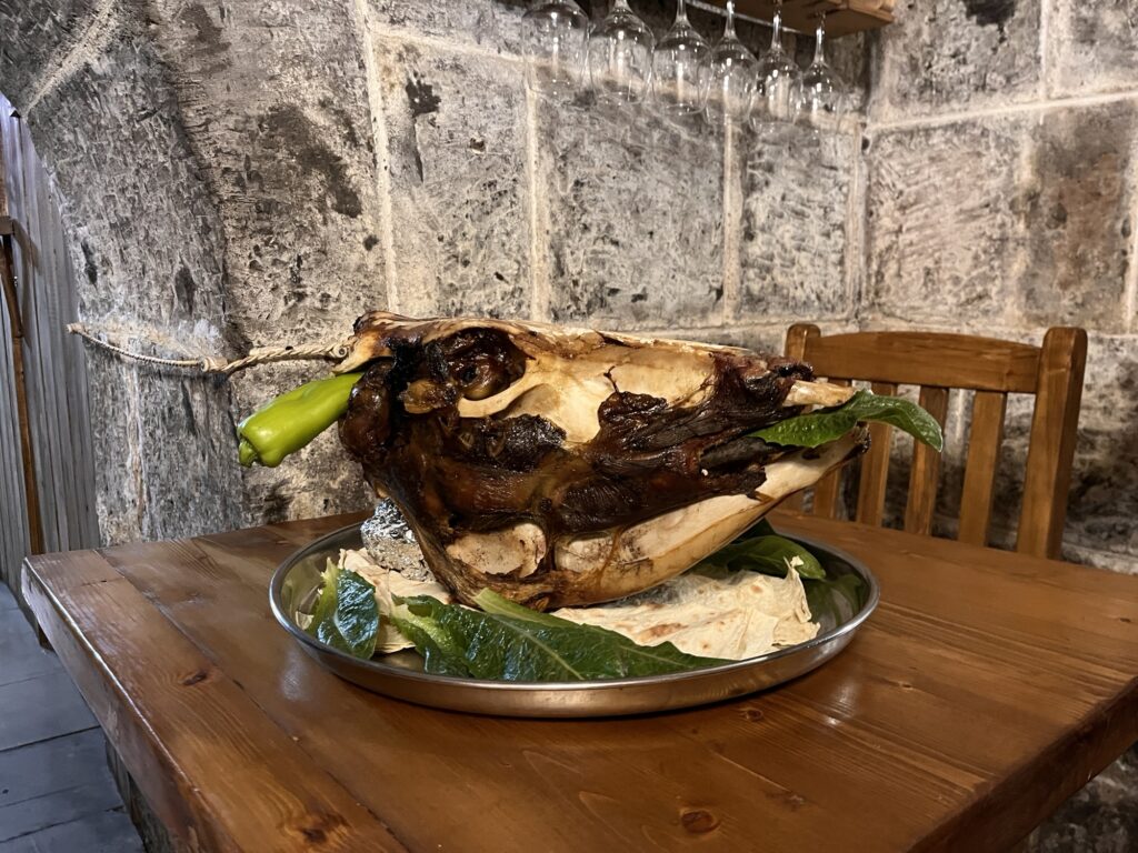 However, the star of the show was the qyalla. Star had spoken about it the previous night on the train and I honestly was not expecting that they would actually order it. Lo and behold — the waitress brings out a sizable qyalla. Qyalla is goats head that traditional would’ve been cooked under ground. What really surprised me was the presentation. Two peppers stuffed on the back of the head and leafy greens in the mouth. It truly was a sight!