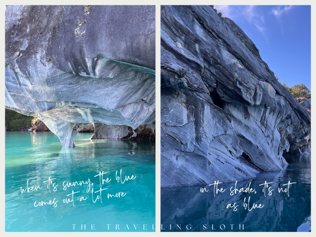 Depends on the weather! The sunlight definitely brings out the colours more. The colour is caused by glacial mineral runoff suspended in the water. On sunny days, the reflections inside the Marble Caves are genuinely spectacular and not exaggerated.